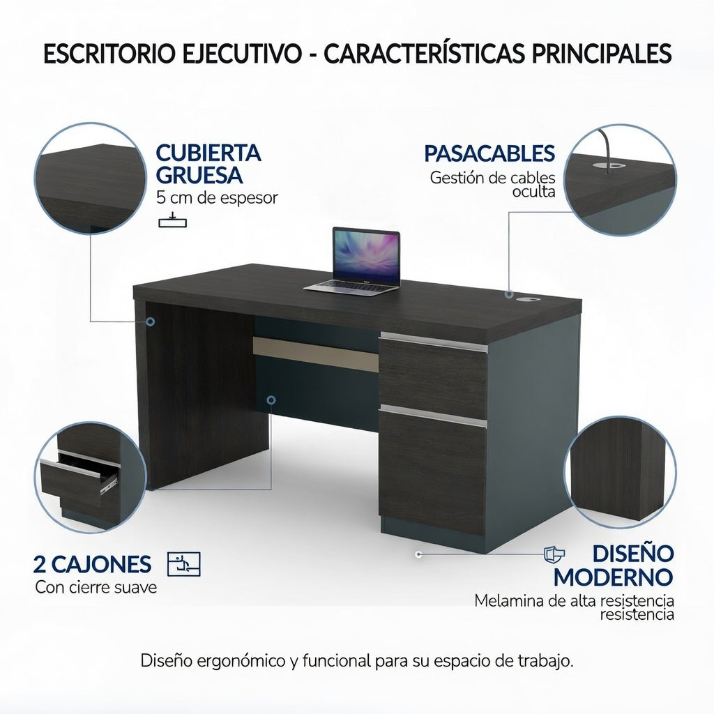 Escritorio Alpha está diseñado para profesionales que demandan funcionalidad y espacio. Su generosa superficie de trabajo permite organizar múltiples proyectos simultáneamente, ideal para oficinas corporativas o espacios de home office. La estructura robusta garantiza estabilidad durante largas jornadas laborales, mientras que sus dimensiones optimizadas se adaptan a diversos ambientes sin comprometer la ergonomía. Perfecto para quienes buscan potenciar productividad con un mueble versátil y de calidad. Cuenta con una robusta cubierta de 5 cms de espesor.